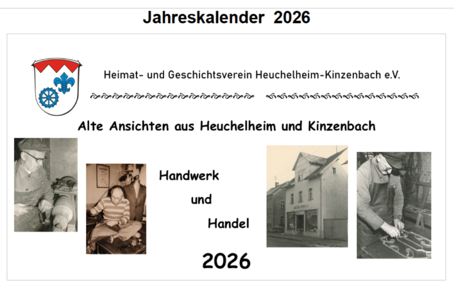 Der Jahreskalender 2026 ist da! Er trägt diesmal den Titel: „Handwerk und Handel“. Historische Aufnahmen zeigen Handwerker, Handwerks- und Handelsbetriebe aus Heuchelheim und Kinzenbach: Schmied, Wagner, Bäcker, Schneider und Küfer u.v.a. sowie Drogerien, Elektro- und Kolonialwarengeschäfte. Die verwendeten Fotos stammen aus den Archiven der Heuchelheimer Museen und von Bürgerinnen und Bürgern der Gemeinde. Die Texte wurden von Werner Rinn und Gerhard Henkelmann (Arbeitskreis Ortsgeschichte) verfasst.